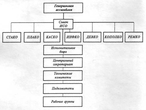 Организационно в ИСО входят руководящие и рабочие органы (рис.1). Руководящие органы: Генеральная ассамблея (высший орган), Совет, Техническое руководящее бюро. Рабочие органы - технические комитеты (ТК), подкомитеты (ПК), технические консультативные группы (ТКГ).