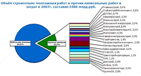 Данные диаграммы также наглядно демонстрируют тот факт, что рынок инженерно-консультационных услуг в России является слабо концентрированным, на крупные компании приходится только 15,5% всего объема услуг, оставшиеся 84,5% приходятся на средний и малый бизнес.