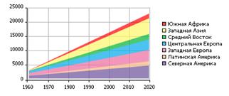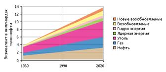 Мировое потребление энергии устойчиво растет на протяжении многих десятилетий, в среднем, на 1.5-2 % в год. По прогнозам, суммарное потребление энергоисточников в мире к 2020 г. достигнет в нефтяном эквиваленте 13 миллиардов тонн в год (см. диаграмму 3.2.1.)
