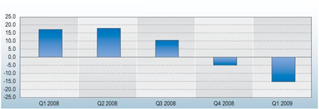 Из таблицы 1.2.1 видно, что в первые три квартала 2008 года, действительно, происходил рост экспорта инжиниринговых услуг, но уже в четвертом квартале 2008 года и первом квартале 2009 года тенденция сменилась, и экспорт стал снижаться быстрыми темпами 15% и 10% соответственно.