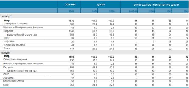 Данные таблицы наглядно демонстрируют спад в международной торговле в отрасли, произошедший в 2008 г. В связи с кризисом в этот период темпы роста значительно снизились, хотя в предыдущие годы преимущественно наблюдались повышательные тенденции на рынке.