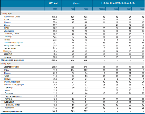 Кроме того, данные также позволяют нам сделать выводы о том, что доля таких крупных игроков на международном рынке, как США, Япония, Канада снижается, зато роль стран БРИК, НИС, наоборот возрастает.