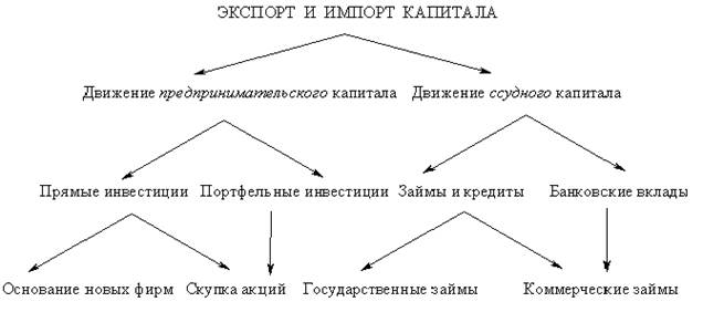 Основную роль играет движение предпринимательского капитала, когда инвестиции идут непосредственно в зарубежное производство. Различают прямые и портфельные зарубежные инвестиции. В первом случае речь идет о капиталовложениях (учреждение новых фирм за рубежом либо приобретение контрольного пакета акций ранее существовавшей зарубежной фирмы), дающих право преимущественного контроля. Во втором случае инвесторы довольствуются получением прибыли на свой капитал (дивидендов от акций).