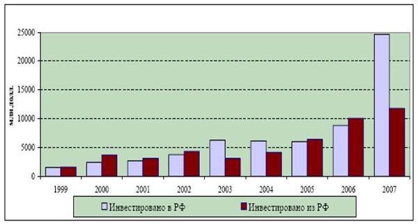 Рис. 2.2. Иностранные инвестиции в РФ и инвестиции из РФ за рубеж в 1999-2007 гг.[10]