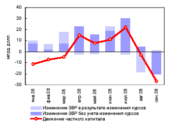 Без учета курсовой динамики, объем ЗВР в сентябре 2008 г. сократился на 20 млрд. долл. По оценке ИКСИ, этой величине соответствует отток капитала в размере 27 млрд. долл. (см. рис.2.6). Таким образом, в сентябре по сравнению с августом отток капитала из России увеличился более чем в 8 раз.