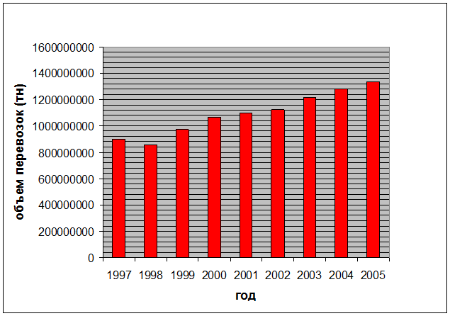 Начиная с 1997 года, наблюдается стабильный рост грузовых перевозок по Российским железным дорогам. Лишь в 1998 году наблюдался определённый спад. Однако уже в 1999 году объем грузовых перевозок превысил уровень 1997 года и составил более 972 миллионов тонн. Постоянный рост объемов перевозок привел к тому, что в 2005 году по железным дорогам России было перевезено более 1 миллиарда 300 миллионов тонн грузов (см. диаграмму 1).