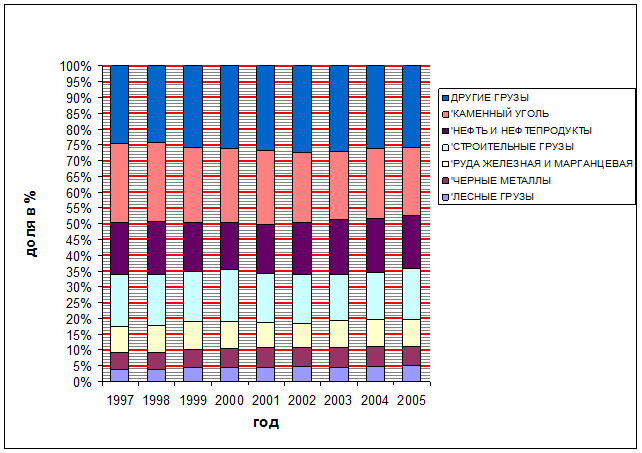 На Диаграмме 3 видно, что наибольший удельный вес в общем объеме перевозок составляли в период с 1997 по 2005 год лишь 6 видов грузов – каменный уголь, нефть и нефтепродукты, строительные грузы, руда железная и марганцевая, черные металлы и лесные грузы. Из диаграммы также видно, что доли этих грузов в общем объеме перевозок менялись в течение данного периода весьма незначительно и, в общем и целом, преобладание этих грузов в общей структуре перевозок кажется закономерным. При этом самым перевозимым грузом на железных дорогах России является каменный уголь (в среднем около 20% всех грузовых перевозок), затем идет нефть и нефтепродукты (около 15%), строительные грузы (около 15%), руда железная и марганцевая (около 10%), черные металлы (около 6%) и лесные грузы (примерно 5%). Прочие виды грузов по отдельности имеют очень малый удельный вес, а в совокупности составляют около трети всех перевозок.