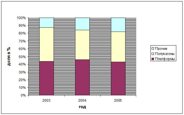 Как правило, для перевозки лесных грузов используются полувагоны и платформы (см. Диаграмму 23). В отдельных случаях для перевозки лесоматериалов по железным дорогам используется специальный подвижной состав, чаще всего платформы со стойками для перевозки леса.