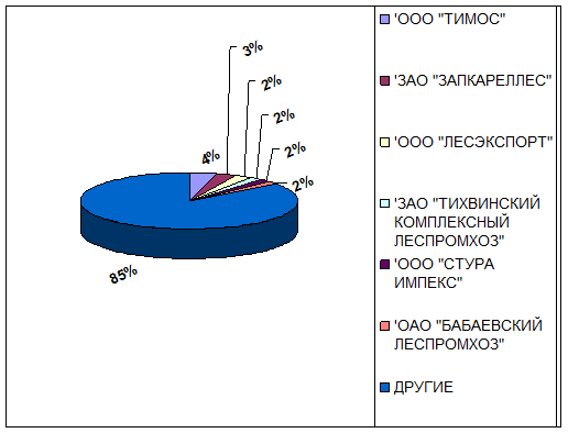 Как видим, 15% экспорта лесных грузов приходится на шесть крупнейших предприятий. Крупнейшим экспортером является ООО «Тимос», которое экспортирует около 35 тысяч тонн лесных грузов ежемесячно. Другим крупнейшим экспортером является ЗАО «Запкареллес», которое экспортирует около 27 тысяч тонн лесных грузов ежемесячно. Крупными экспортерами также являются ООО «Лесэкспорт», ЗАО «Тихвинский КЛПХ», ООО «Стура импекс», ОАО «Бабаевский ЛПХ».