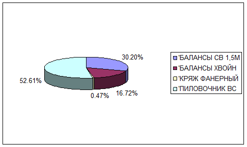 Если посмотреть на структуру экспорта лесных грузов ООО «Тимос» по Октябрьской железной дороге, видим, что на экспорт в основном идет пиловочник высокосортный (52.61% от общего экспорта лесных грузов ООО «Тимос» по Октябрьской железной дороге), затем идут балансы свыше полутора метров, балансы хвойные и кряж фанерный. (см. Диаграмму 26)