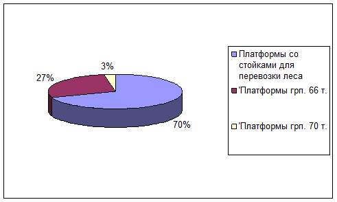 Как следует из Диаграммы 28, 30% лесных грузов ООО «Тимос» экспортируется по Октябрьской железной дороге в универсальных вагонах, а именно 27% - в платформах грузоподъемностью 66 тонн и 3% в платформах грузоподъемностью 70 тонн. Однако 70% лесных грузов ООО «Тимос» экспортируется по Октябрьской железной дороге в специализированных вагонах, а именно в платформах со стойками для перевозки леса.