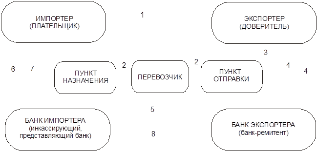 Схему расчетов по инкассо можно представить упрощенно в следующем виде: после заключения контракта, в котором оговаривается, через какие банки будут производиться расчеты, экспортер производит отгрузку товара. После получения от перевозчика транспортных документов экспортер передает все необходимые документы в банк. которому он поручает осуществлять инкассирование (банк-ремитент). Банк ремитент, проверив документы, направляет их банку-корреспонденту в стране импортера (инкассирующий банк). Последний, проверив документы, представляетих импортеру-плательщику. Инкассирующий банк может делать это непосредственно или через другой банк (так называемый представляющий банк). Документы выдаются плательщику: