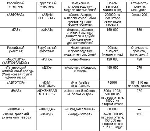 В 90-е годы автомобилестроение представляло одну из отраслей российской экономики, для которых было характерно наиболее интенсивное развитие международного технологического сотрудничества. К середине 1998 года практически все российские автозаводы продекларировали намерение или уже имели реальные планы использовать свои производственные мощности для выпуска новых моделей автомобилей в кооперации с зарубежными партнерами. Инвестиционный потенциал возможных сделок оценивался на уровне более чем в 2 млрд. долл.
