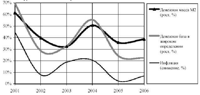 Приложение 13[18] «Темпы роста денежной базы в широком определении и денежной массы М2 и уровень снижения инфляции»