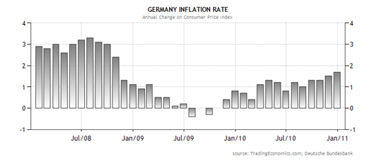 По данным Федерального статистического ведомства Германии, в ноябре 2010 года индекс потребительских цен в ФРГ увеличился на 0,1% по сравнению с февралем того же года (в сравнении с предшествующим месяцем индекс не увеличился). По состоянию на 1 февраля 2011 г., уровень инфляции составил 1,7% в годовом исчислении (рис.3). Основной причиной инфляции, как и в предыдущие месяцы, является рост цен на энергоносители, без которых рост инфляции составил бы 1,1%. Наибольший вклад в рост цен внесли следующие группы товаров: газ, жидкое топливо, бензин, а также овощи (+11,1%), услуги по ремонту и содержанию жилого фонда (+4,2%), туристические поездки с предварительной оплатой расходов (+4,1%). Напротив, цены снизились на одежду и обувь (-0,9%), предметы домашнего обихода (-1,4%), телефонные услуги (-3,5%) и технику для обработки информации (-8,0%).