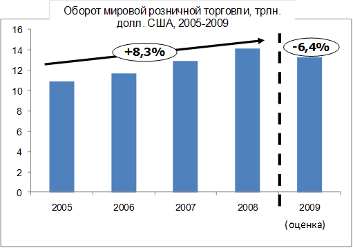 Общемировой оборот сектора розничной торговли рос в период с 2005 по 2008 год со средним темпом в 8,3%. В 2008 году оборот мировой розничной торговли достиг 14,5 трлн. долларов США[1]. Вследствие экономического кризиса в 2009 году по предварительным данным отмечается снижение оборота розничной торговли на 6,4%.