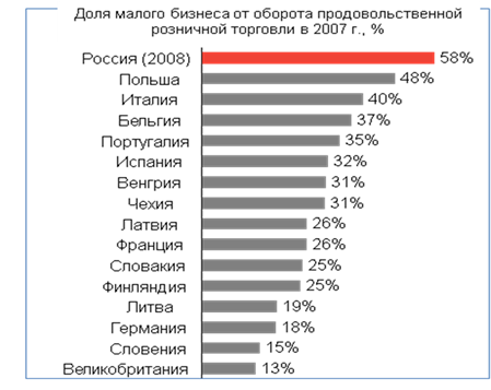 Рис. 4. Доля малого бизнеса от оборота продовольственной розничной торговли в 2007 г.