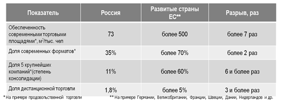 В настоящий момент Россия существенно отстает от развитых стран по всем ключевым параметрам развития сектора торговли.