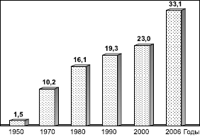 Третья стадия полного алюминиевого цикла – выплавка первичного алюминия. Рост ее во второй половине XX в. – и начале XXI в. показан на рисунке 80. В целом он отражает поступательную тенденцию развития этой отрасли, хотя можно добавить, что после мирового энергетического кризиса середины 1970-х гг. темпы ее роста в целом несколько замедлились. В последнее время не увеличивается и число стран, производящих первичный алюминий (в конце 1990-х гг. их было 45).