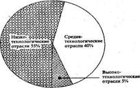 Магистральное направление мирохозяйственной стратегии России состоит в развитии наукоемкой готовой продукции (авиационное машиностроение, научные приборы и инструменты, средства телекоммуникаций, некоторые виды химической продукции, фармацевтические товары). Вся эта продукция имеет устойчивые и растущие рынки сбыта за рубежом. Пока же (в середине 90-х гг.) доля продукции высокотехнологичных отраслей в российском экспорте товаров обрабатывающей промышленности составляет 5%, что значительно ниже среднего показателя по странам Организации экономического сотрудничества и развития (23—25% в первой половине 90-х гг.) (см. рис. 1).
