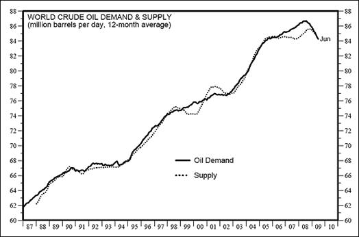 Рис. 2.4. Спрос и предложение нефти в мире 1987-2009 гг.