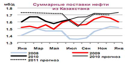 Исходя из рисунка видно, что наиболее благоприятный период поставок нефти из Казахстана наблюдается в 2010 году и по сравнению с 2008 годом поставки возросли на 16%. В свою очередь 2011 год обещает быть неблагоприятным, по прогнозам. И в августе 2011 года ожидается существенный спад поставок нефти из Казахстана, скорей всего это будет связано с экономическими процессами и глобализацией мировой экономики.