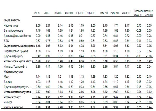 Из таблицы 4 видно, что сокращение экспортной пошлины для российской нефти улучшило экономику добычи, и, соответственно, производители увеличили объемы перевозок. В результате экспорт сырой нефти постепенно достиг нового рекордного уровня в 6.8 мб/д (+4.7%). Поставки по Черному морю в течение месяца возросли на 25%, совместно с ростом поставок по трубопроводу Дружба это возместило незначительное сокращение поставок по Балтийскому морю и в Арктике/Дальнем Востоке. Увеличение поставок по Черному морю осуществлялось через порт в Новороссийске, объемы поставок достигли 1 мб/д (+350 кб/д при сравнении по месяцам). Перевозки возросли и за счет поставки на экспорт нефти, ранее содержащейся в портовых хранилищах. Объемы прокачки нефти через украинский порт Pivdenne в течение месяца удвоились в связи с проведением технического обслуживания в других портах, но они оставались сниженными по сравнению с уровнем до начала июня. Транспортировка нефтепродуктов возросла на 240 кб/д (+8.3%) до 3.1 мб/д благодаря окончанию сезонного технического обслуживания на НПЗ и сокращению экспортной пошлины на нефтепродукты. Эти изменения побудили экспортеров организовать отправку нефтепродуктов на экспорт, отложенную в прошлом месяце. Поставки мазута возросли на 120 кб/д, поставки газойля и «других нефтепродуктов» - на 60 кб/д по каждой категории.