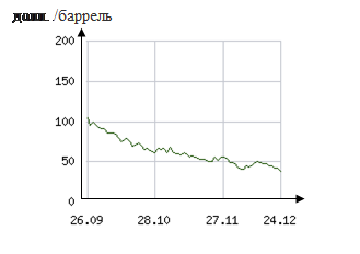 Отток же частного иностранного капитала из РФ в январе-ноябре 2008г. составил около 80 млрд долл. Об этом сообщил первый заместитель Председателя Банка России Алексей Улюкаев, отметив, что по итогам 2008г. он может достичь 100 млрд долл.[12] Только в октябре из России ушли 50 млрд. долларов (для сравнения: за весь кризисный 1998г. из страны убежали лишь 21,7 млрд. долл.), вдобавок стоимость нефти на мировых рынках упала ниже 55 долл. за баррель.[13] На рисунке (см. рис. 2) приведена динамика цен на нефть за последние три месяца 2008 (на 24.12.08 до 36,61 долл. за баррель)[14].