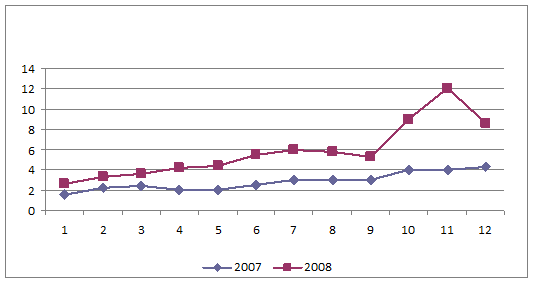 Усиление конкуренции на внутреннем финансовом рынке в 2008 г. привело к повышению ставок по банковским депозитам. Так, средневзвешенная ставка по рублевым депозитам населения в кредитных организациях сроком до одного года повысилась с 5,4% годовых в январе 2008 г. до 6,2% годовых в октябре, а средневзвешенная ставка по рублевым депозитам предприятий сроком до одного года - с 3 до 6,7%.