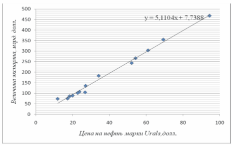 Объем экспорта РФ на 92,75% зависит от цены на нефть марки Urals. С повышением (понижением) цены нефти марки Urals на 1доллар объем экспорта страны повышается (снижается) в среднем на 5,1104 млрд. долларов. Увеличение объемов экспорта оказывает положительное влияние на экономику страны: растут доходы от продажи российских товаров за рубеж, создаются новые рабочие места для производства этих товаров, растет степень вовлеченности страны в международную торговлю, укрепляются экономические связи между государствами.
