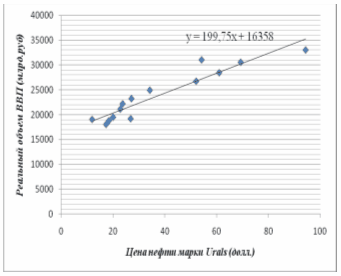 В долгосрочной перспективе фактический объем прироста ВВП РФ на 88,94% определяется уровнем мировых цен на нефть. С повышением (понижением) цены нефти марки Urals на 1доллар объем реального ВВП страны повышается (снижается) в среднем на 199,75 млрд. руб.