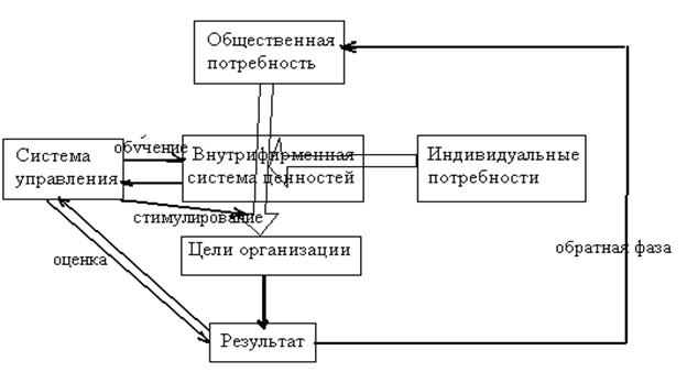 Из представленной модели хорошо видно, что механизм самодвижения простейшего социального организма состоит из двух фаз: прямой – от потребности общества в товарах или услугах до внутрифирменной системы ценностей. И, обратной - от внутрифирменной системы ценностей до товара или услуги, произведенных для снятия потребности человека.