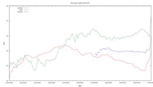 Синим цветом показана стоимость бивалютной корзины с февраля 2005 года. Скачки на графике соответствуют изменению формулы расчета стоимости корзины.