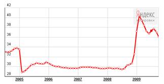 Рис.2. График динамики изменения значения бивалютной корзины с 2005 по 10.2009 год, руб. [10]