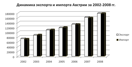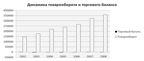 Итак, по данному графику наглядно видно, что экспорт имеет тенденцию к постоянному росту: в 2008 г. рост объемов экспорта составил 10,2 %. Импорт также имеет тенденцию к повышению. В 2008 г. рост объемов импорта составил 11,5 %.