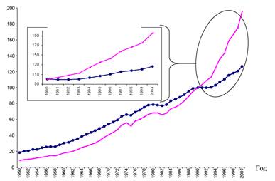 Начиная со второй половины XX в. рост внешней торговли России приобрел взрывной характер. В период 1950-2003 гг. объем мирового экспорта, рассчитанный в неизменных ценах, вырос в 21,8 раза (среднегодовой темп роста – 6,4%). За этот же период мировое производство выросло в 7,1 раза (среднегодовой темп роста – 4,0%).[6]