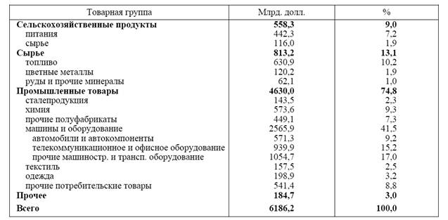 Таким образом, доля экспорта в производстве выросла в 3 раза. В текущих ценах к 2003 г. доля экспорта в ВВП достигла 20,2%.[7] Наибольшие темпы роста внешней торговли наблюдались в 50-е годы (7,2%) и 60-е (8,6%). В 70-е и 80-е годы эти темпы последовательно замедлялись (5,2 и 3,9% соответственно), чтобы вновь стремительно вырасти в 90-е (7,0%). При этом больше всего с 1950 по 2003 г. увеличился экспорт промышленных товаров (в 42 раза) и в гораздо меньшей степени экспорт сырья (в 8,3 раза) и продовольствия (в 5,9 раз). В 90-е годы наиболее быстрыми темпами рос экспорт офисного и телекоммуникационного оборудования (12% в год), машиностроительного и транспортного оборудования (8%), химической продукции (7%).[8]