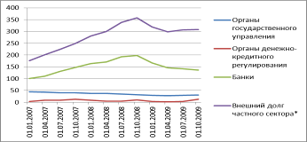 Внешние долговые обязательства субъектов Российской Федерации на 1 января 2009 года уменьшились с 1,5 до 1,3 млрд. долларов США. По данным Центробанка общий внешний долг России увеличился в первом полугодии 2009 года на 24,2% и составил почти 385 миллиардов долларов. В 1998 году он не превышал и 150 миллиардов. Правда, его структура теперь совсем иная: лишь 10% всего долга страны приходится на долги государства и государственных структур и 90% общей задолженности - это долги компаний и банков.