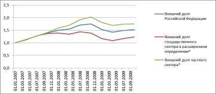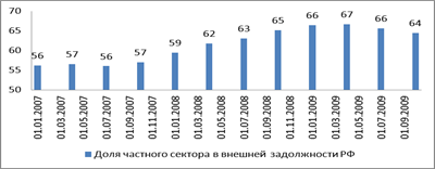 В целом внешний корпоративный долг в период кризиса претерпел существенные изменения. В период с 1 января 2007 года по 1 ноября 2009 года объем внешнего долга частного сектора вырос на 75%, что в абсолютных значениях составило 132,3 млрд. долл. Его доля во внешнем долге РФ за этот период в целом увеличилась на 8%.(Диаграмма 1)