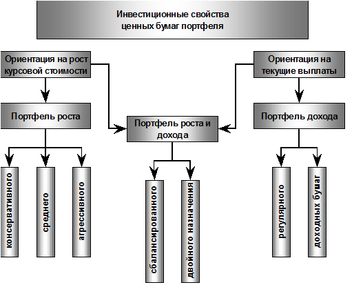 Выделяют два основных типа портфеля: портфель, ориентированный на преимущественное получение дохода за счет процентов и дивидендов (портфель дохода); портфель, направленный на преимущественный прирост курсовой стоимости входящих в него инвестиционных ценностей (портфель роста). Было бы упрощенным понимание портфеля как некой однородной совокупности, несмотря на то, что портфель роста, например, ориентирован на акции, инвестиционной характеристикой которых является рост курсовой стоимости. В его состав могут входить и ценные бумаги с иными инвестиционными свойствами. Таким образом, рассматривают еще и портфель роста и дохода.