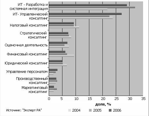 Как следствие к концу 2005 года доля сектора ИТ в общей структуре консалтингового рынка увеличилась на 8 процентных пунктов и достигла отметки в 54%. Тогда же мы сделали прогноз, что автоматизация ради автоматизации скоро исчерпает себя и перспективы консультантов будут зависеть от их готовности совмещать два типа технологий — управленческих и информационных (см. журнал "Эксперт" №14 за 2005 и 2006 год). Клиенты поймут, что автоматизация плохо налаженного бизнеса не только не приносит пользы, но многократно усиливает уже имеющиеся управленческие проблемы.