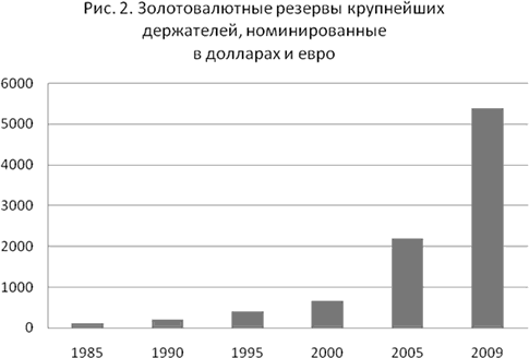 В 1990-е годы происходит быстрая долларизация финансов всех крупнейших стран, в первую очередь экспортеров на мировой рынок. Глобализация оказалась тождественно равна долларизации. На рис.2 показан рост золотовалютных резервов в Китае, Японии, России, Саудовской Аравии, Индии, Южной Корее, Бразилии, Германии, Сингапуре, Алжире, Таиланде, Италия, Швейцарии и Франции вместе взятых.