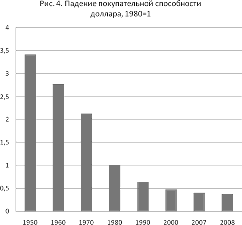 Долларизация сопровождалась изменением роли золота в мировой финансовой системе, сужением его функций. Доллар практически заменил золото в качестве средства расчёта. В последние полвека расширялся отрыв доллара от этой традиционной меры стоимости – золота, что сопровождалось снижением покупательной способности американской валюты. Реальная покупательная способность доллара сегодня примерно в десять раз ниже, чем она была в 1950-м году (рис.4).