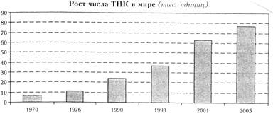 Главными материальными носителями усиливающейся транснационализации экономической деятельности выступают транснациональные корпорации (ТНК), число которых за последние 35 лет возросло в 11 раз (см. рис. 1). Первой ТНК можно считать созданную в 1602 г. корпорацию Dutch' East India Company. Вслед за ней возник целый ряд аналогичных структур, некоторые из них (например, Hudson Bay Company) сохранились и поныне. Однако за следующие триста лет процесс образования ТНК шел относительно медленными темпами. Его динамика существенно возросла после Первой мировой и особенно после Второй мировой войн.