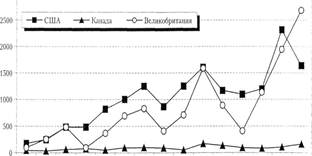 Прежде всего отметим значительные темпы прироста трансграничных потоков капитала за рассматриваемый период (17% в среднем за год в США, 26,9 - в Великобритании и 9,8% - в Канаде). Но при этом рост потоков капитала не был постоянным. Так, в США и Великобритании имели место два отчетливых спада - в 1998 и 2001 – 2002 гг. Первый был, очевидно, связан с последствиями потрясений на азиатских и российском финансовых рынках, а второй - со спадом активности на фондовом рынке развитых стран. В Канаде, помимо отмеченных, наблюдался спад в 1995 г., а спад 2001-2002 гг. распространился и на 2003 г.