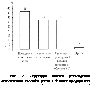 В нашем исследовании выявлена, к сожалению, еще одна тенденция - пассивное отношение руководителей предприятий к участию в формировании рынка интеллектуальной собственности: только 27,6% предприятий-респондентов заинтересованы в продаже прав на объекты интеллектуальной собственности на внутреннем и 28,5% - на внешнем рынках. Заслуживает внимания структура ответов респондентов относительно способов учета в балансе предприятия интеллектуальной собственности (ИС) (см. рис. 7), свидетельствующая о начальном этапе данного процесса. Если помнить о качественном составе предприятий- респондентов, то вполне приемлемыми для нашей страны можно считать полученные показатели.