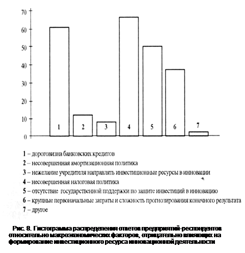 Распределение ответов предприятий-респондентов относительно макроэкономических факторов, отрицательно влияющих на формирование инвестиционного ресурса инновационной деятельности (см. рис. 8), свидетельствует о преобладании таких факторов, как дороговизна банковских кредитов; отсутствие дешевых долгосрочных кредитов; несовершенная налоговая политика, "вымывающая" средства обращения и не стимулирующая формирование инвестиционного ресурса за счет прибыли; отсутствие государственной поддержки по защите инвестиций на реализацию инновационных проектов.