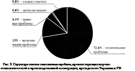 Среди правовых проблем, которые в первую очередь препятствуют научно-технологической и производственной кооперации предприятий Украины и РФ, названы: 41,5% - отсутствие взаимосогласованного законодательства, которое бы регулировало процесс международной кооперации; 26,8% - отсутствие правовой базы, регулирующей научно-технологическое сотрудничество между предприятиями РФ и Украины; 11,4% - несоответствие норм законодательства в аналогичных сфера другой стороны.