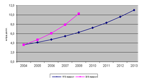 В 2005 г. объем товарооборота со странами БВСА при сохранении динамики предыдущих лет может увеличиться на 15–20% и достичь 4–4,5 млрд. долл. Этому способствуют высокие мировые цены на сырьевые товары и возрастающий спрос в ряде арабских стран на продовольствие и сельскохозяйственную продукцию, а также на другие традиционные товары российского экспорта. При сохранении этих тенденций объем товарооборота с арабскими странами достигнет максимальных показателей 1990 г. в лучшем случае через 8–11 лет. Большой удельный вес сырья в структуре российского экспорта в арабский регион при низкой доле продукции высокого передела неизбежно поставит динамику развития российско-арабской торговли в зависимость от конъюнктуры мировых цен на сырьевые товары и, как следствие, приведут к сокращению темпов прироста товарооборота. Такой сценарий развития на деле будет означать неуклонную трансформацию всего комплекса российско-арабских экономических отношений на их подчинение задачам удовлетворения главным образом текущих потребностей нынешних торговых партнеров в сырье и полуфабрикатах и окончательное вытеснение российских технологических товаров из оборота.