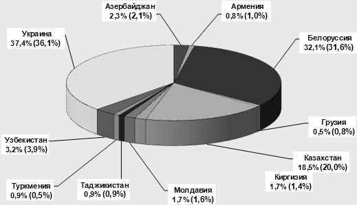 Рисунок 1 – Географическая структура торговли России со странами СНГ в 2008 году (2007 год) (в % от общего объема товарооборота со странами СНГ).
